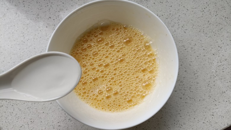 9. 加适量白糖、盐、白胡椒粉充分打散,加三勺清水搅匀,炒出的蛋更滑嫩;