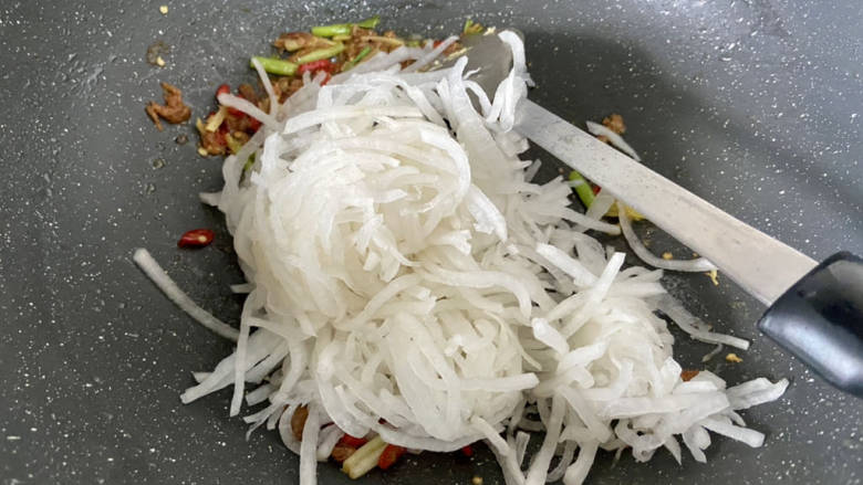 10. 加入白萝卜丝,中大火翻炒一两分钟,炒干水分