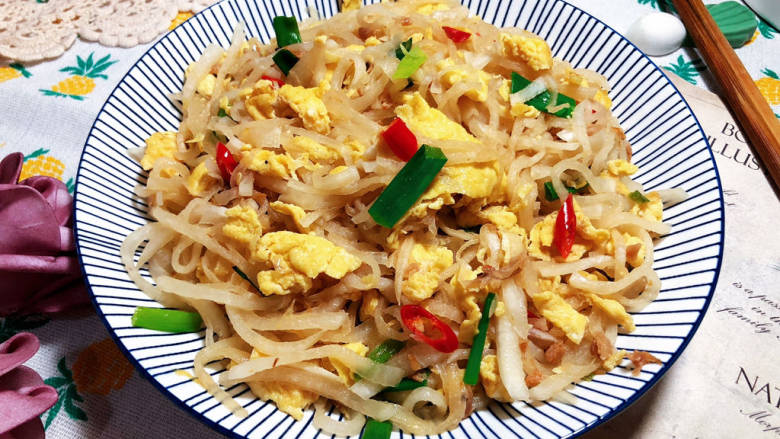 阿晨从小就爱吃白萝卜,喜欢它的脆甜多汁,最爱的就是白萝卜烧肉和炖汤,吸满汤汁的白萝卜真的太棒了。 白萝卜营养丰富,含有芥子油、淀粉酶和粗纤维,具有促进消化,增强食欲,加快胃肠蠕动和止咳化痰的作用。中医理论也认为该品味辛甘,性凉,入肺胃经,为食疗佳品,可以治疗或辅助治疗多种疾病,本草纲目称之为“蔬中最有利者”。 今天我们就用白萝卜做个简单的小炒菜~白萝卜丝炒鸡蛋,煸香的虾皮增加了菜品的鲜味,白萝卜脆嫩,鸡蛋焦香,咸鲜味美,十分下饭。感兴趣的小伙伴一起来看看吧😄