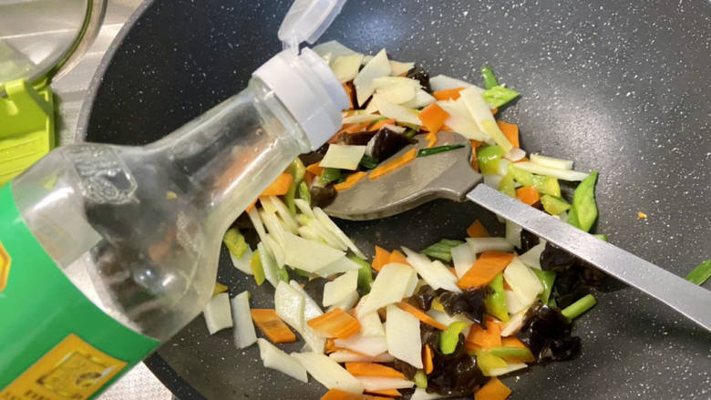 6. 加入胡萝卜片青椒块,中火翻炒断生