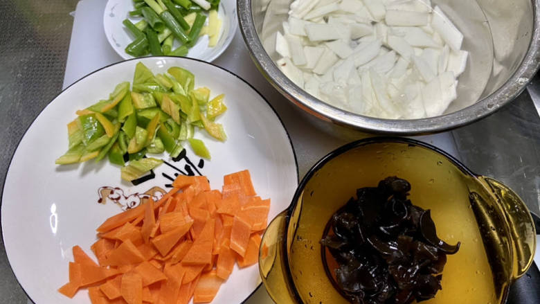 3. 改刀:山药切片清水浸泡以免氧化变黑,胡萝卜切片,青椒切块,木耳撕小朵,小葱切段,姜切丝