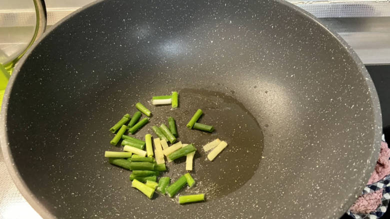 5. 热锅后加适量食用油,加入姜丝小葱段,中小火煸香