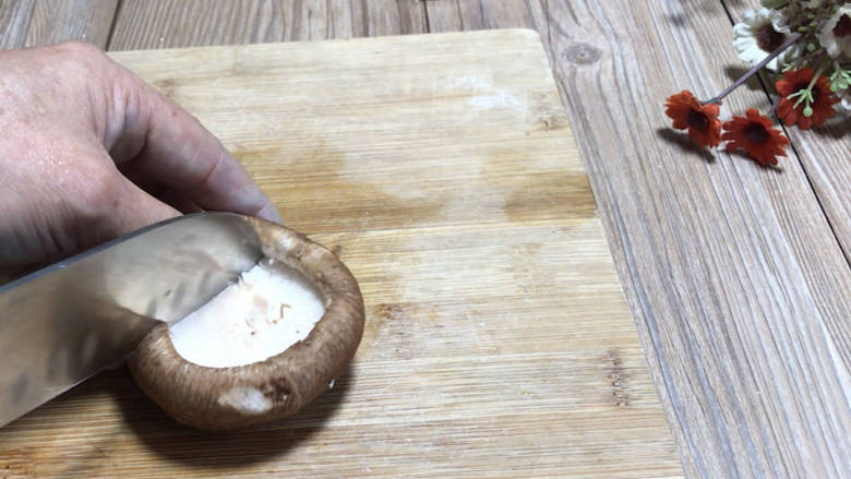 - 买香菇的时候尽量买肉薄模样大点的,如果肉厚不好包馅可以把香菇正面的肉片下来,这样就很容易包馅了哦!