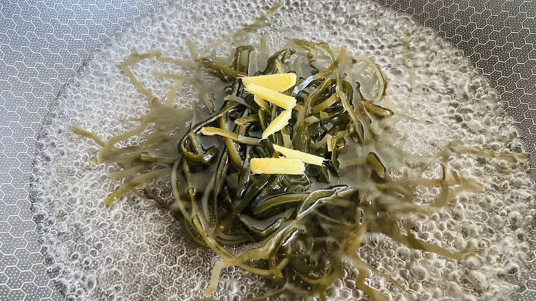 7. 锅中加入适量清水大火烧开放入海带丝和姜丝煮熟