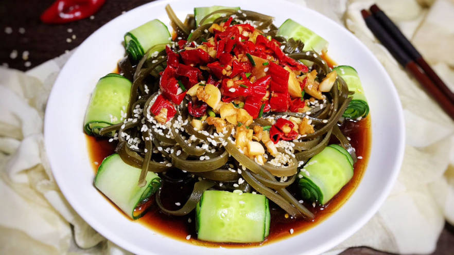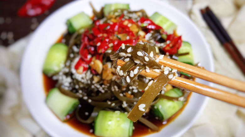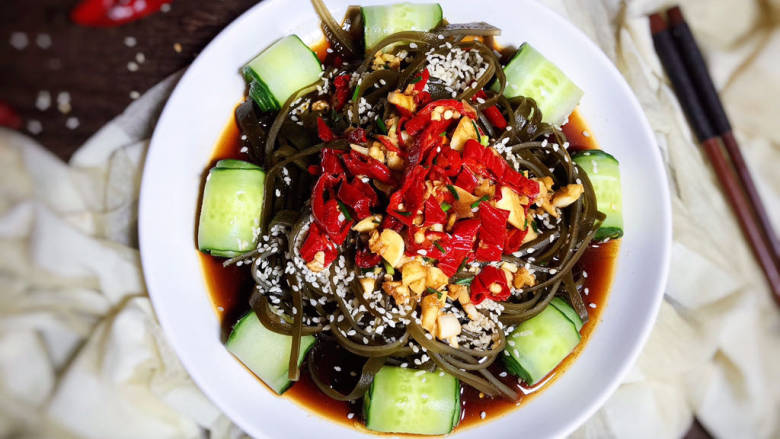 海带是一种在低温海水中生长的大型海生褐藻,可以用于拌、烧、炖、焖等烹饪方法。海带是一种营养价值很高的蔬菜,同时具有一定的药用价值。含有丰富的碘等矿物质元素。海带含热量低、蛋白质含量中等、矿物质丰富,具有抗辐射、减肥排毒、促进钙吸收等功效。加入芝麻可以掩盖海带的腥味,吃着更香。