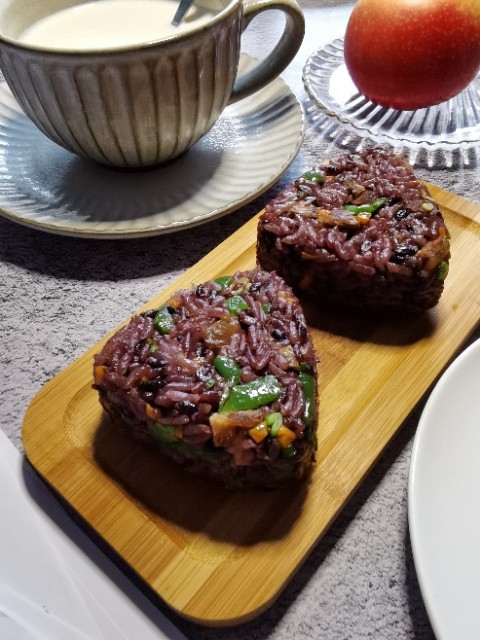 昨天吃剩下的黑米饭,配上青椒胡萝卜,牛肉丁,放在饭团模具中压成形,有模有样,吃起来更有味道!