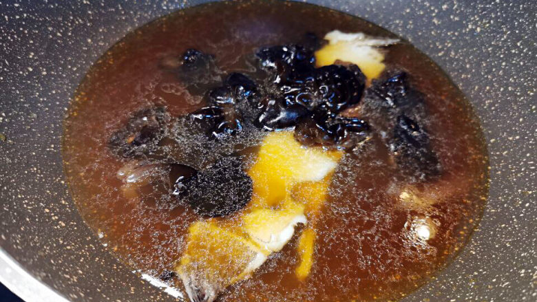 20. 煮开后,过滤掉葱段,只留下汤汁,先下鱼骨与木耳,煮熟