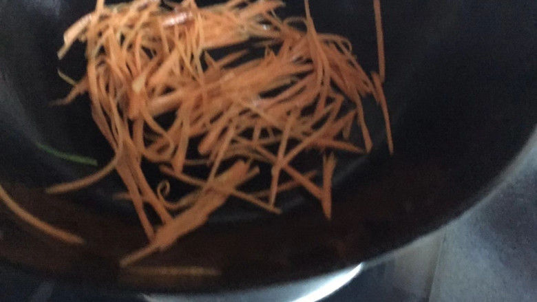 11. 锅内倒油,下入胡萝卜丝翻炒