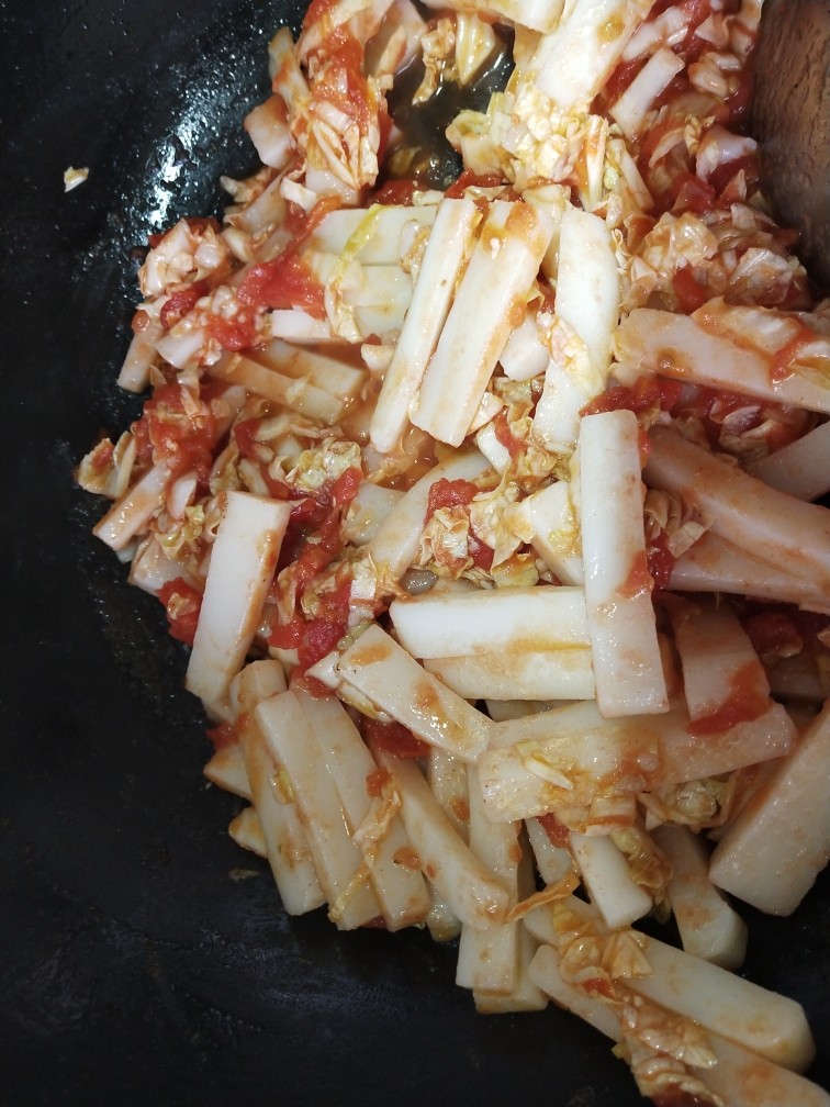 16. 再倒入年糕,翻炒一会,加点开水再炒一会,因为年糕起先已经焯熟
