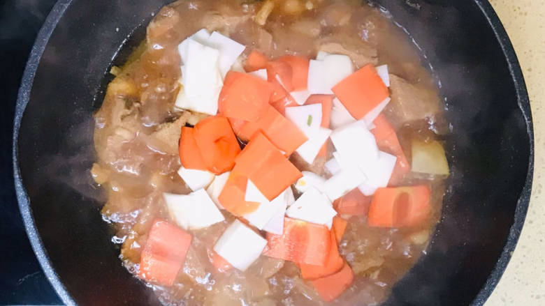 13. 大火煮沸,慢火收至汤汁浓稠,加入蔬菜