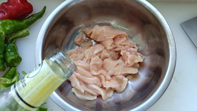 3. 腌制鸡胸肉,倒入1勺料酒;