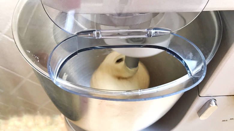 3. 利用厨师机搅打至完全阶段,成可以拉出手套膜的光滑的面团