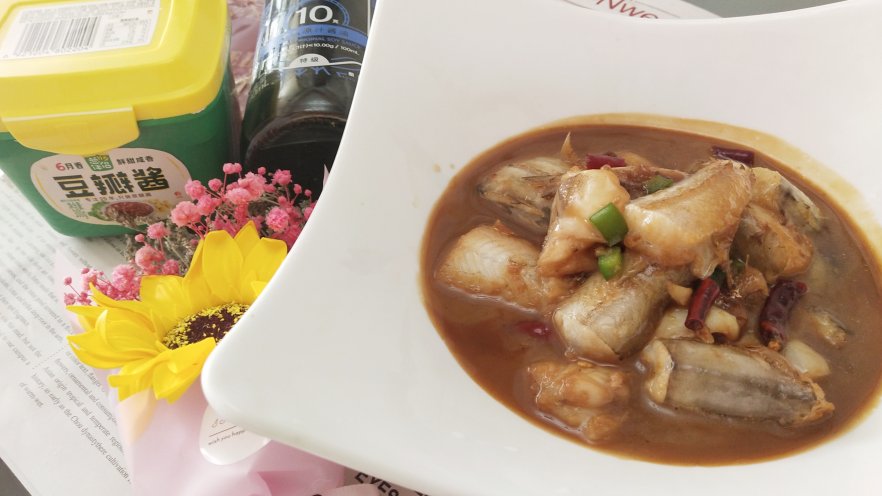 - 水潺水分极多,不用加多水,烧煮几分钟,放入豆瓣酱,起锅时撒点葱花,(今天家里没葱了,就放了点尖椒装饰一下,颜值也重要)一盘色香味俱全的酱烧水潺就成了。