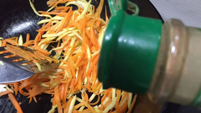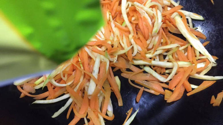 6. 下入蒜末炒香,倒入胡萝卜丝