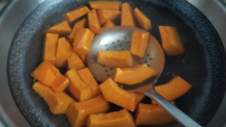 2. 锅中烧水,水开下入南瓜焯水30秒捞出控干水分