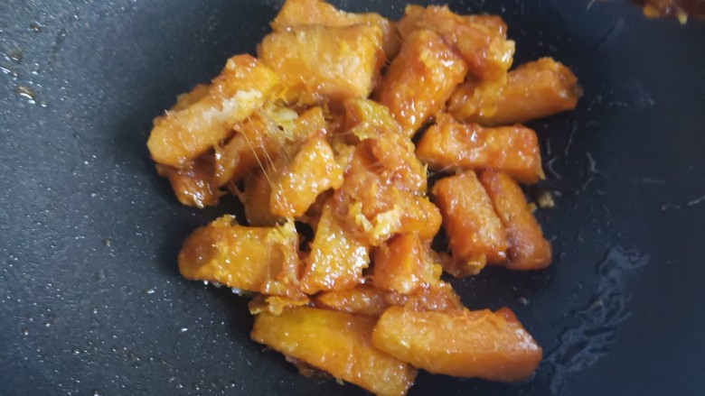 12. 随着糖浆慢慢变凉,南瓜的颜色会越来越深,能够看得到糖丝,夹起南瓜能够拔长的金丝