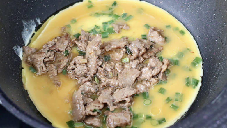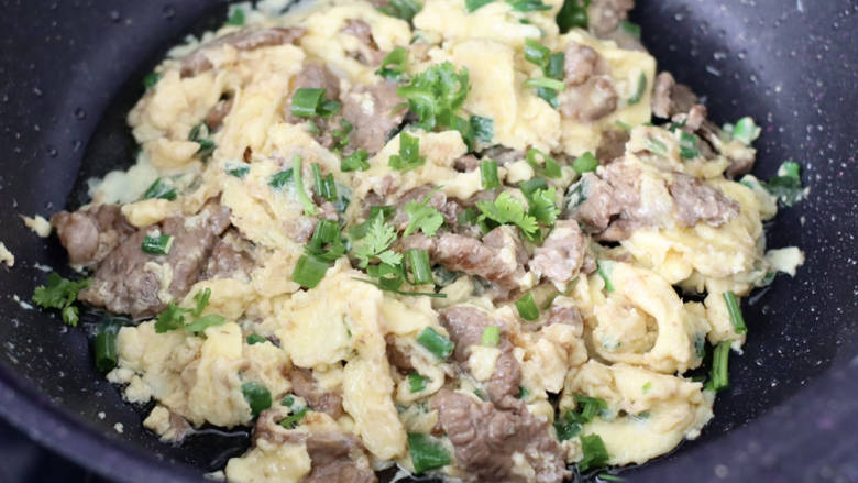 16. 小火用锅铲慢慢推入蛋液,让每片牛肉都裹上蛋液,炒至蛋液凝固,撒葱花香菜末即可~
