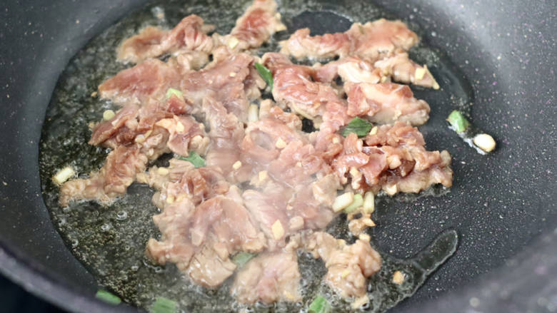 12. 油锅烧至七成热时,放入牛肉片慢慢翻炒至。