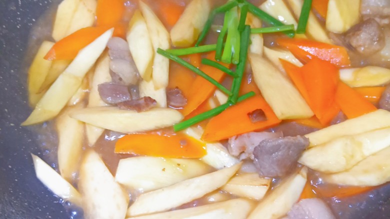 5. 猪肉翻炒至变色后,逼出肥肉里的油,再加上胡萝卜翻炒