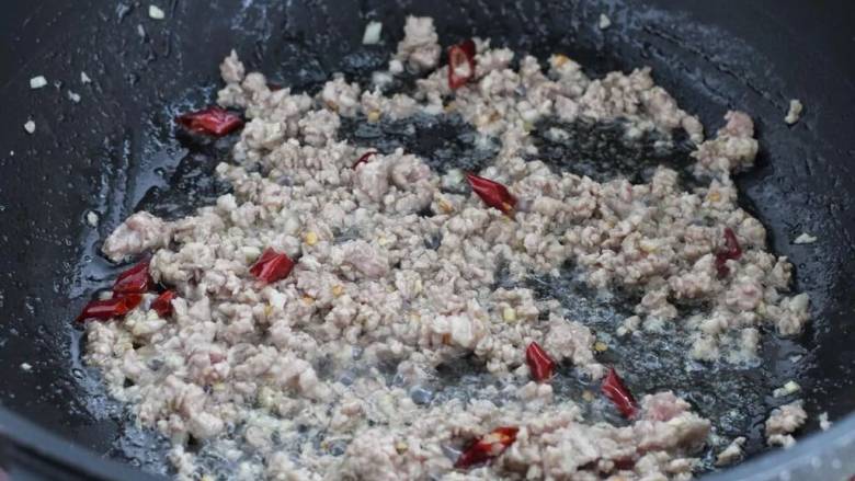 4. 接着放入肉糜炒散至发白变色状态。