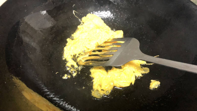 4. 热锅冷油到鸡蛋炒至凝固定型,加玉米粒
