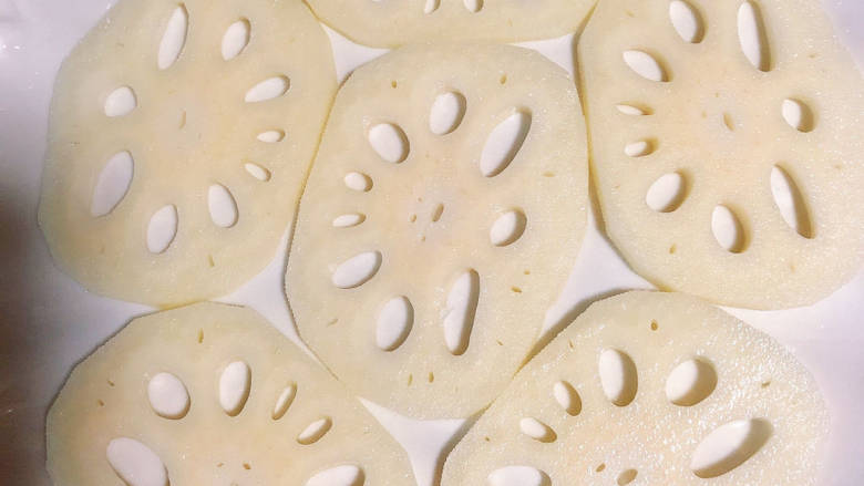 6. 将肉馅放在藕片上,中间压出一个坑,打入鹌鹑蛋。