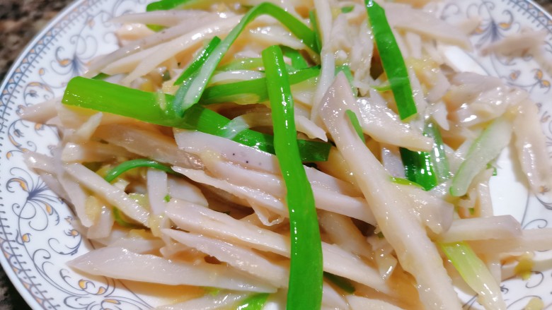 10. 再把莲藕丝放入,加入食用盐翻炒均匀
