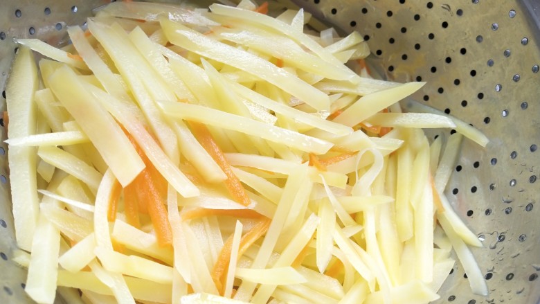6. 锅里放开水,把胡萝卜和土豆放进去焯一下,大概1分钟左右