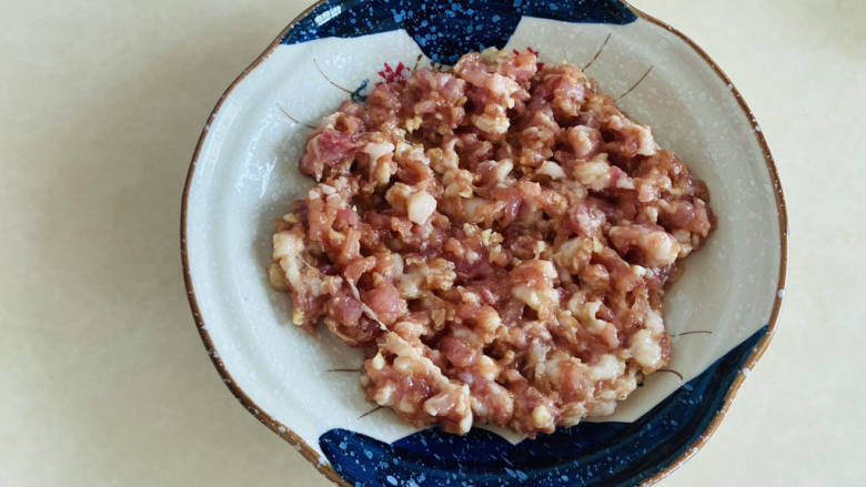 4. 肉末放入碗中加入一勺生抽、料酒,适量的盐、鸡精、胡椒粉、食用油、淀粉