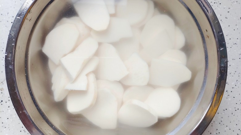6. 芋头去皮洗净,切成片,不要切太厚,以免不易熟透