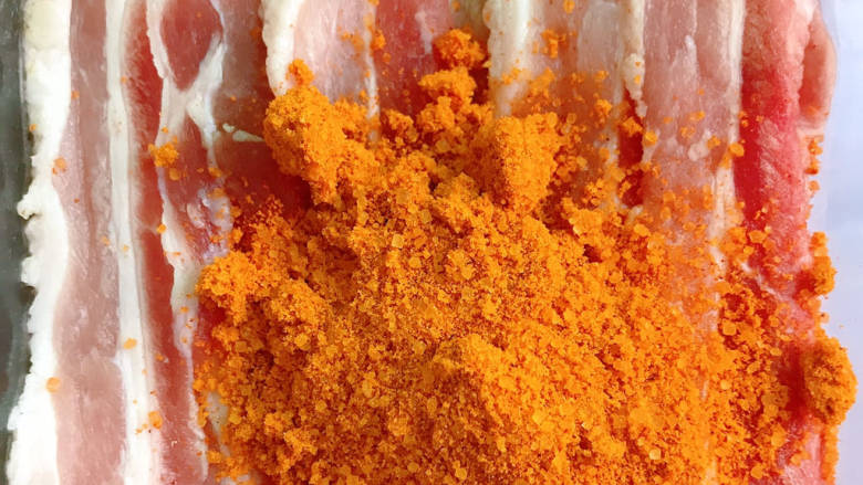 5. 烤盘铺上油纸,将腌制好的五花肉平铺在上面
