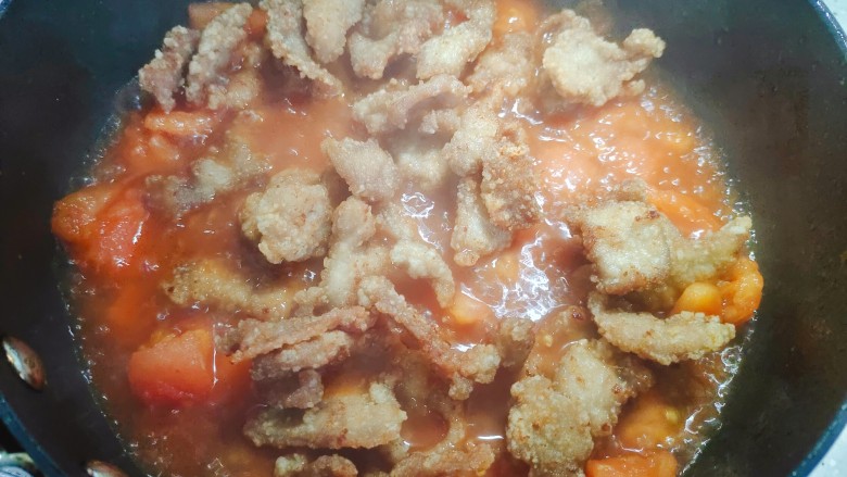 8. 锅内留少许底油,下番茄,翻炒至稍稍出沙