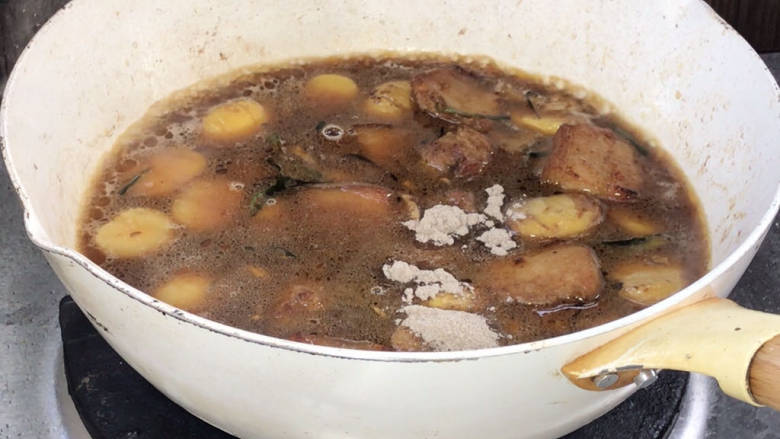 11. 放入适量开水、胡椒粉拌匀,煮沸后转小火,盖上锅盖烧20分钟