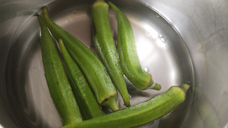 5. 泡好的秋葵洗净,放进锅里焯一下,加点盐和油。