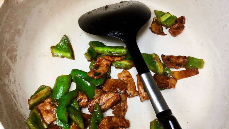 8. 起锅烧油,放入肉片煸炒,放姜片,葱花,少许五香粉,放少许盐,放生抽,老抽煸炒到肉片变色,放菜椒继续煸炒
