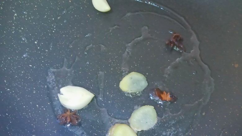4. 锅内加入适量食用油,加入姜片,蒜瓣,八角爆香