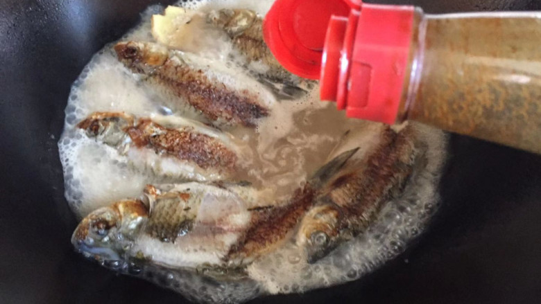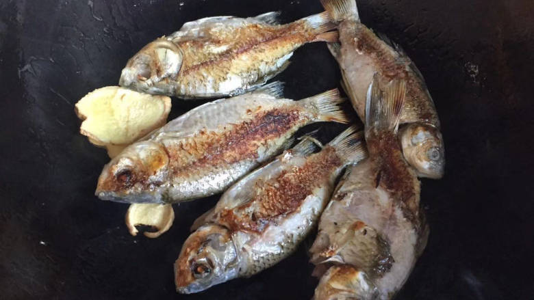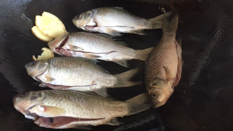 4. 热锅倒油,下入姜片,然后将鲫鱼逐个下入煎