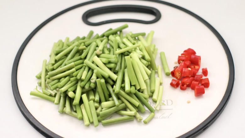 2. 蒜苔去根洗净切段,小米辣切圈。