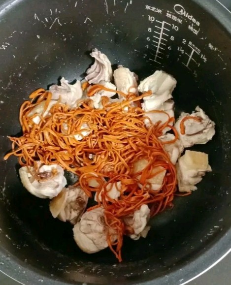 10. 倒入浸泡虫草花的水,再加入适量清水