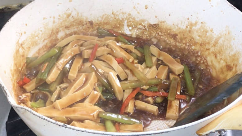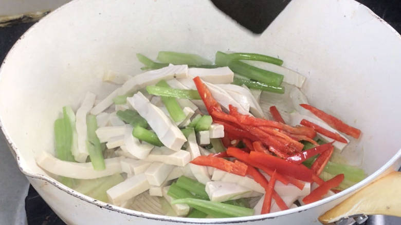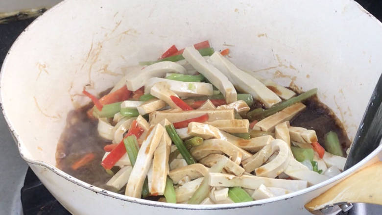7. 放入芹菜、豆腐干、红椒,翻炒均匀