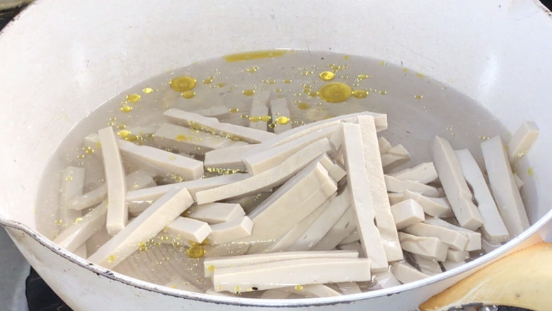 4. 起锅注入适量清水,放入少许盐和油,放入豆腐干煮沸