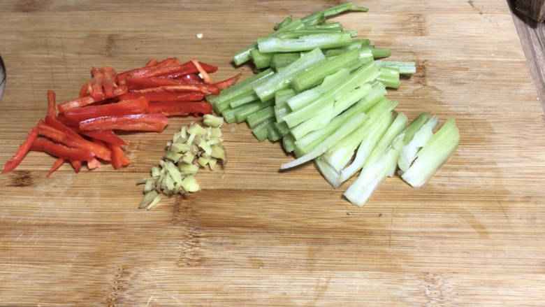 2. 芹菜拍松切段,再切成条,备好姜末和红椒丝