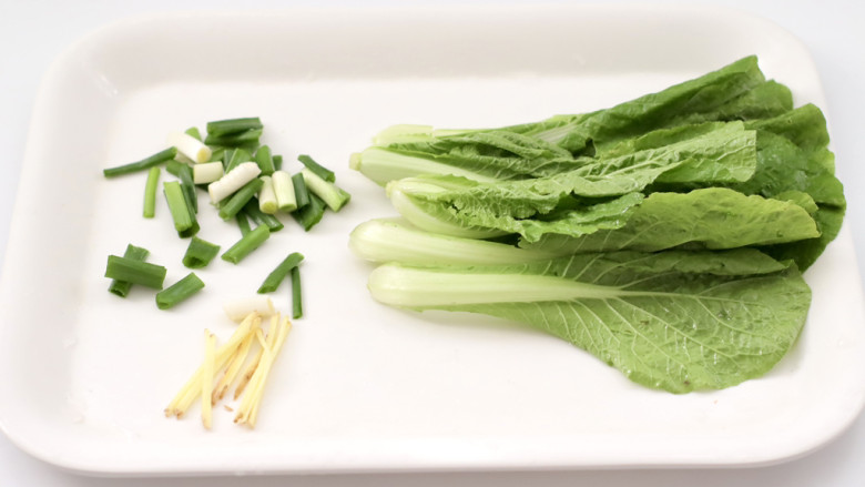 2. 青菜摘洗干净,葱姜切丝。