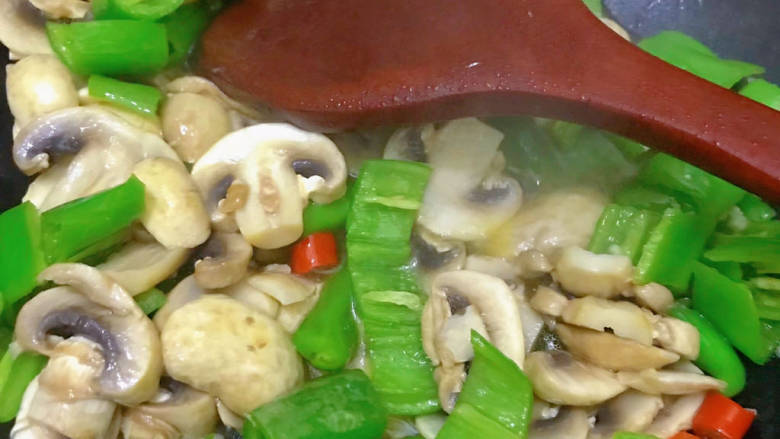 21. 将鲜蘑菇和青辣椒翻炒均匀