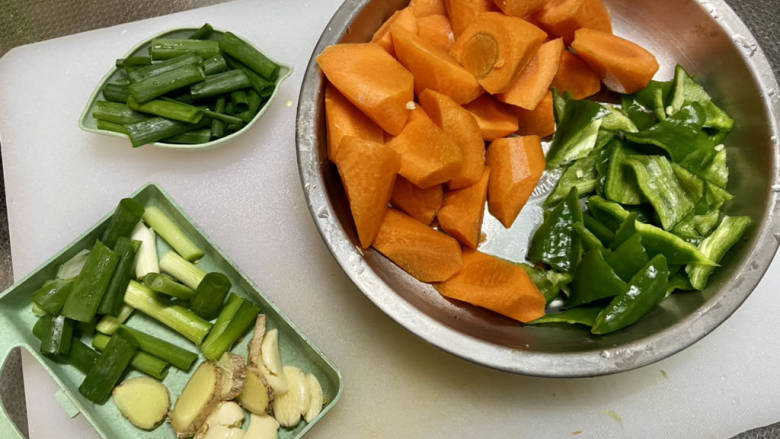 3. 胡萝卜切块,青椒切块,小葱葱白切段,葱叶切末,姜切片,蒜拍一下