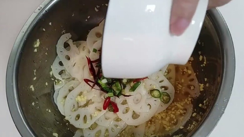 14. 用热油浇出切碎的葱辣椒和姜的香气。