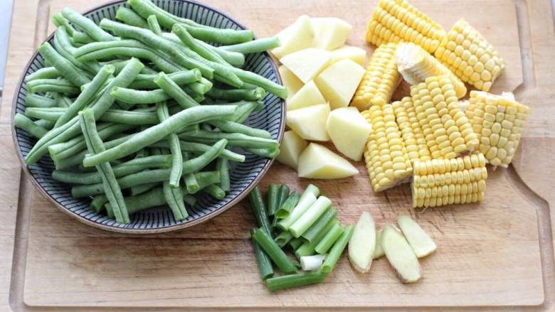 11. 排骨炖到时间后加入豆角、玉米和土豆,翻拌均匀继续炖十分钟加少许盐调味。