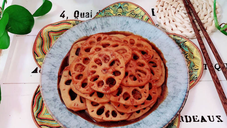 姜汁红糖莲藕,宴客菜上少不了的经典菜。吃过了大鱼大肉之后,爽口解腻,非它莫属! 莲藕中含有黏液蛋白和膳食纤维,能与人体内胆酸盐,食物中的胆固醇及甘油三酯结合,使其排出,从而减少脂类的吸收。莲藕散发出一种独特清香,还含有鞣质,有一定健脾止泻作用,能增进食欲,促进消化,开胃健中,有益于胃纳不佳,食欲不振者恢复健康。