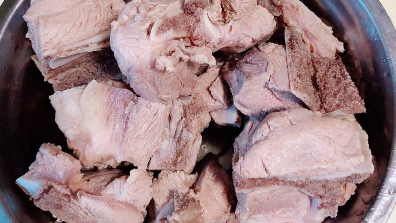 2. 锅中烧开水,下入排骨焯去血水,捞出洗净待用。