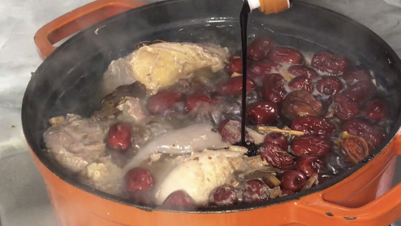 4. 老抽放入沸腾的卤水锅中